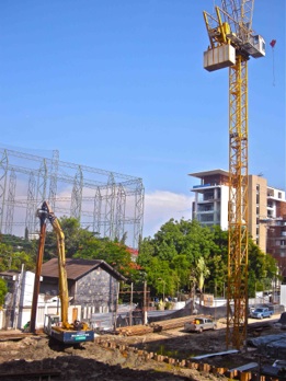 Until a few months ago, from our balcony, the scene was idyllic by Bangkok standards. A couple of small neat houses, a lawn and plenty of trees. Birds were heard singing in the morning and in the evening, there was almost silence. And in place of that we now have, you guessed it, a construction site.